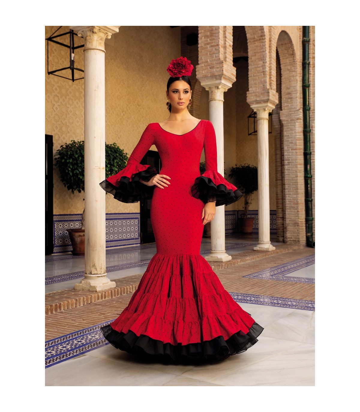 Traje de flamenca rojo lunar negro. El corte del vestido está diseñado para realzar la silueta femenina ajustándose al cuerpo hasta las rodillas, donde se abre una falda de mucho vuelo de volantes canasteros acabada con un volante de organdí negro para dar contraste.