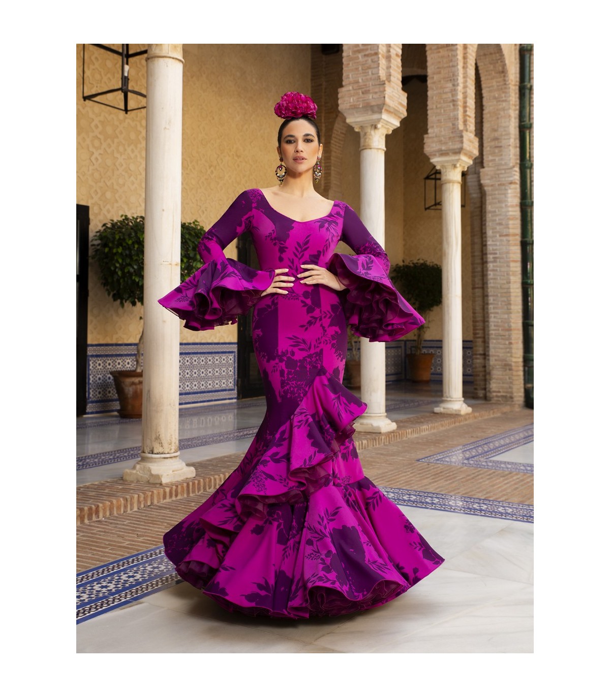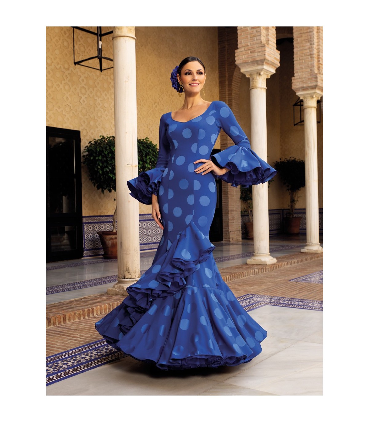 El diseño de cuerpo enterizo en el que el cuerpo y la falda se unen estiliza mucho la figura. Acaba en un volante grande, desde donde sube un volante al costadillo. El corte del vestido está diseñado para realzar la silueta femenina ajustándose al cuerpo pero al no ir la falda cortada da más amplitud y resulta más fácil el movimiento.