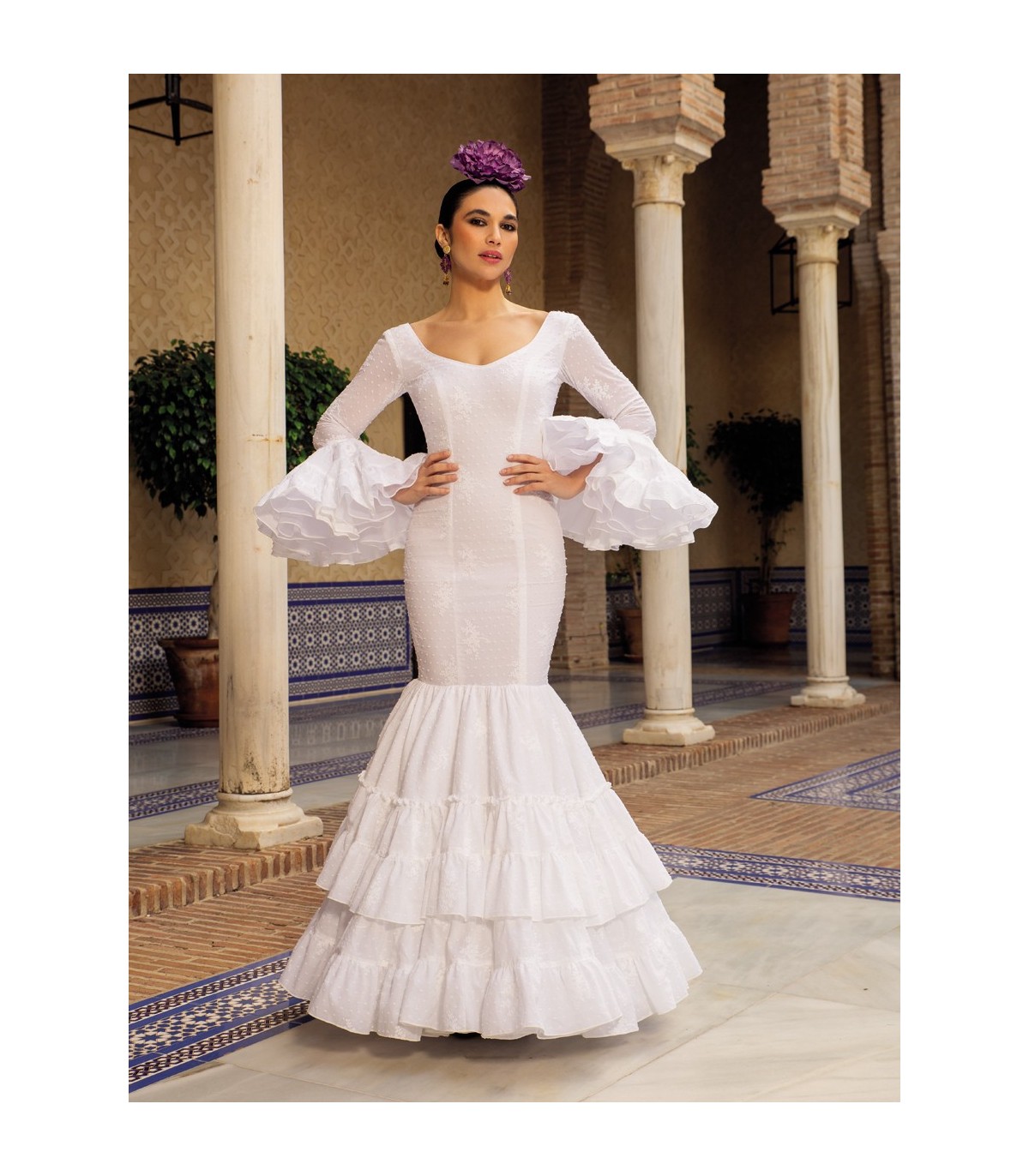 Traje de flamenca plumeti blanco con bordado. El corte del vestido está diseñado para realzar la silueta femenina ajustándose al cuerpo hasta las rodillas, donde se abre una falda de dos volantes canasteros.