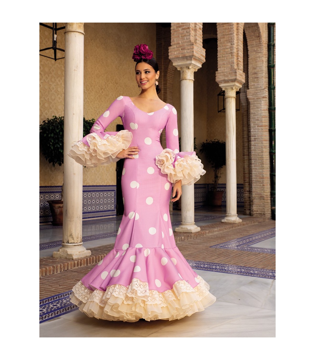 Incluye enagua y volantes de organdí en el interior de falda y mangas para dar más volumen sin que aporte peso, por lo que resulta un traje muy vistoso y elegante a la vez que cómodo.