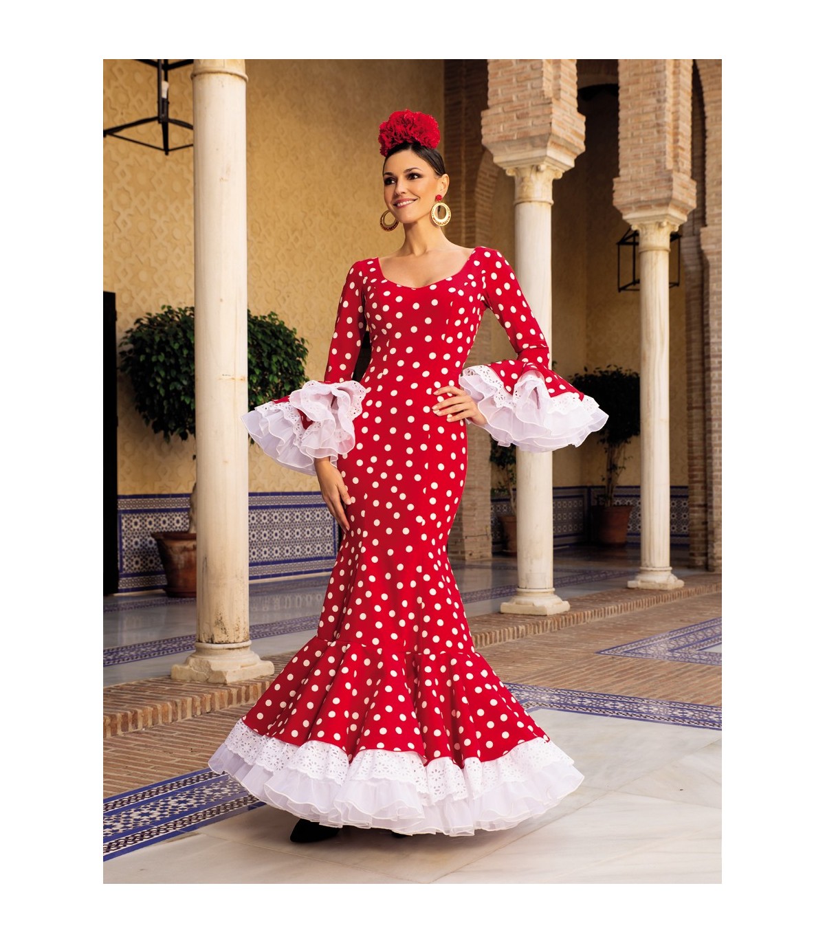 Traje de flamenca con falda acaba en un volante grande donde asoma una tira bordada junto con un volante de organdí para dar contraste. El diseño de traje enterizo en el que el cuerpo y la falda se unen estiliza mucho la figura. El corte del vestido está diseñado para realzar la silueta femenina ajustándose al cuerpo pero al no ir la falda cortada da más amplitud y resulta más fácil el movimiento.