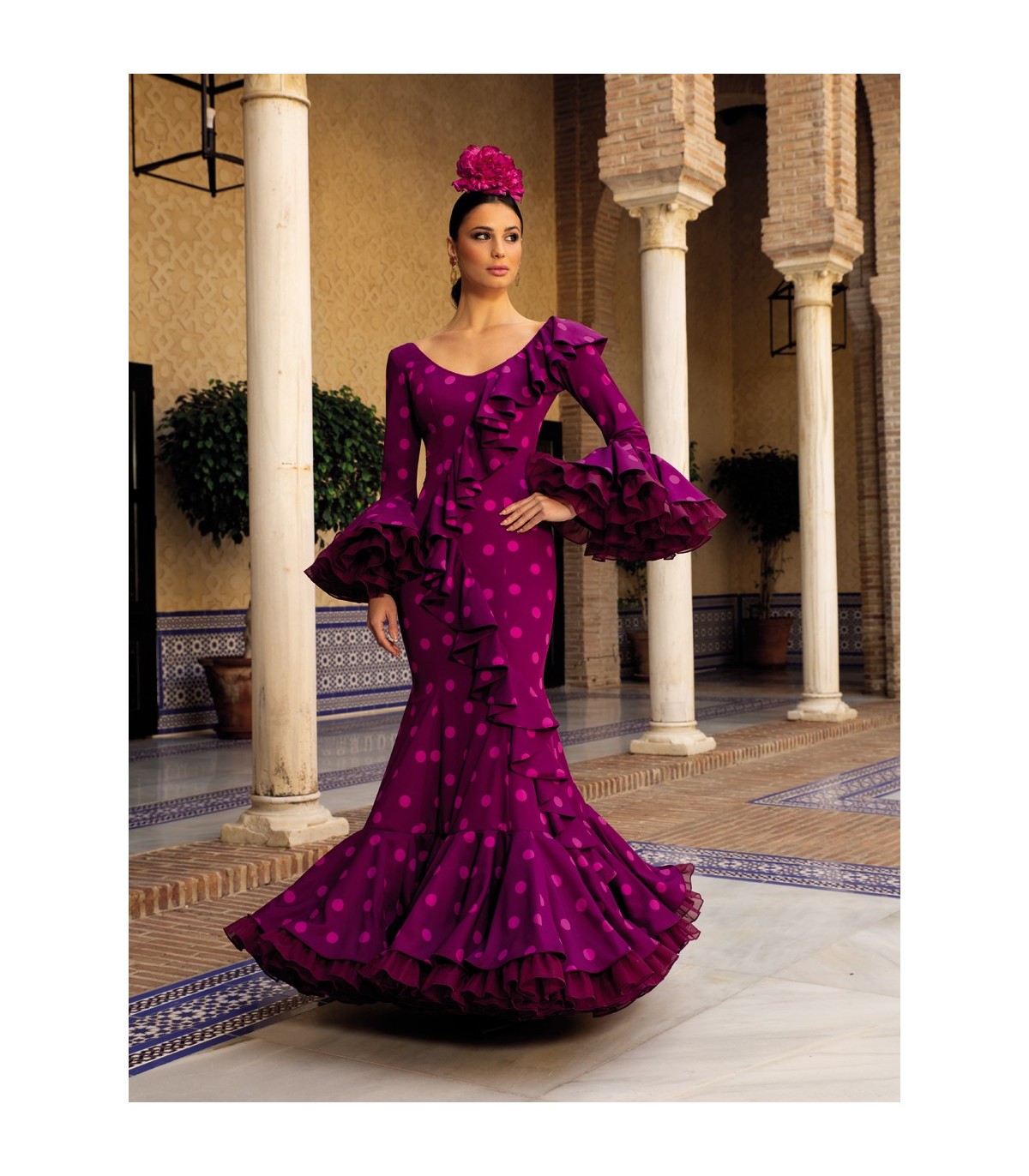 Traje de flamenca morado lunar buganvilla. El diseño de traje enterizo en el que el cuerpo y la falda se unen estiliza mucho la figura. La falda acaba en un volante grande donde asoma un volante de organdí en color buganvilla adornado con un volante desde el hombro hasta la falda. El corte del vestido está diseñado para realzar la silueta femenina ajustándose al cuerpo pero al no ir la falda cortada da más amplitud y resulta más fácil el movimiento.