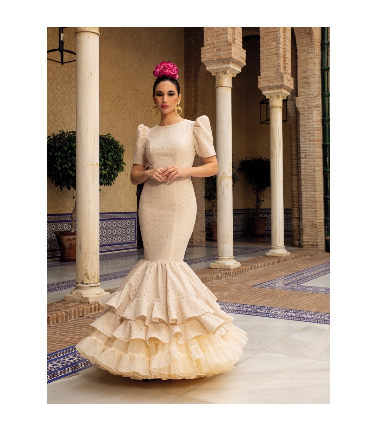 Traje de flamenca perforado beige tostado. El corte del vestido está diseñado para realzar la silueta femenina ajustándose al cuerpo hasta las rodillas. Talle recto donde se abre una falda de mucho volumen con dos volantes, acabada en una tira de volantes de organdí en beige. Escote a la caja y escote de la espalda abierta en triángulo. Mangas cortas tipo farol.