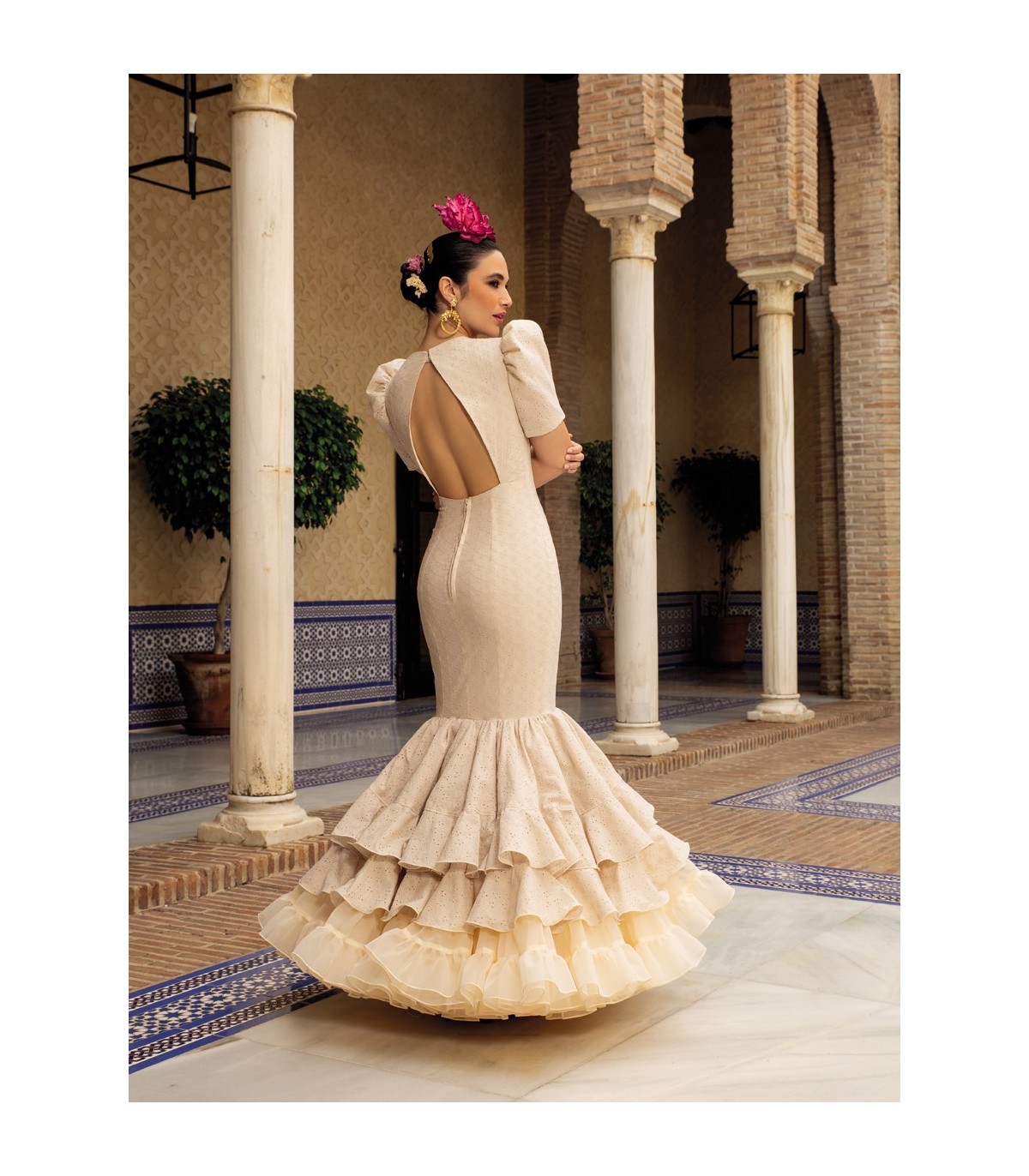 Traje de flamenca perforado beige tostado. Falda de mucho volumen con dos volantes, acabada en una tira de volantes de organdí en beige. Escote a la caja y escote de la espalda abierta en triángulo. Mangas cortas tipo farol..