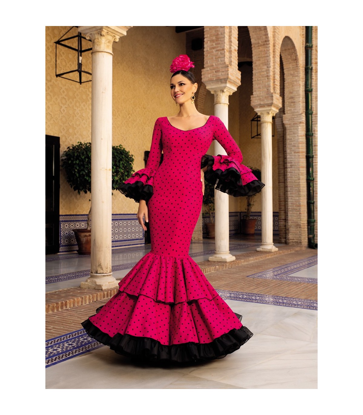Traje de flamenca fucsia lunar negro. Tejido rústico tipo lino pero sin arrugas. El corte del vestido está diseñado para realzar la silueta femenina ajustándose al cuerpo con un por la rodilla, donde se abre una falda de dos volantes acabada en un volante de organdí negro para dar contraste.