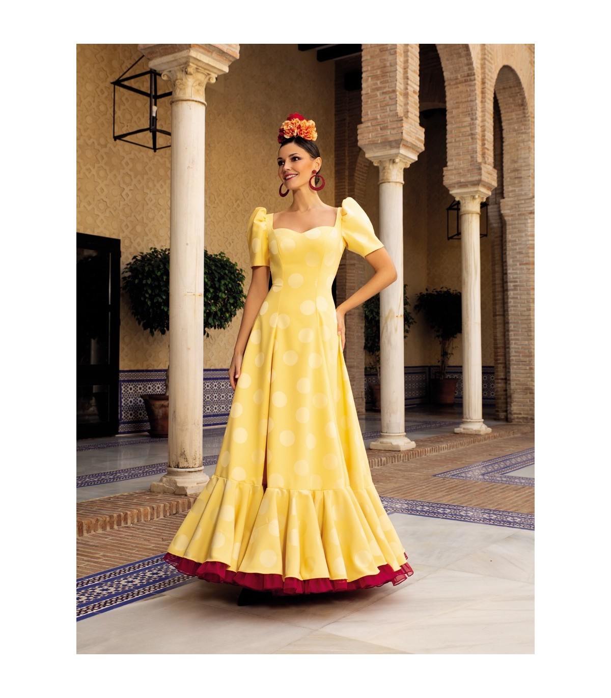 Bata flamenca manga farol color amarillo en tejido de jacquard. Traje enterizo con un volante en la falda seguido de una tira de organdí burdeos.
